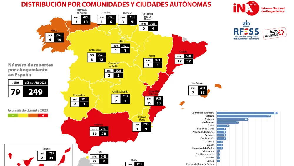 De hecho, el 2023 se posiciona como el año con mayor cantidad de fallecidos en los últimos cinco años y el tercero en los últimos ocho. Las regiones más afectadas son Andalucía, Cataluña, Comunidad Valenciana y las Islas Canarias. En cuanto a los espacios más peligrosos, las aguas cercanas a la costa se destacan, donde más de la mitad de las muertes ocurren, seguidas por piscinas, ríos y otros cuerpos acuáticos.